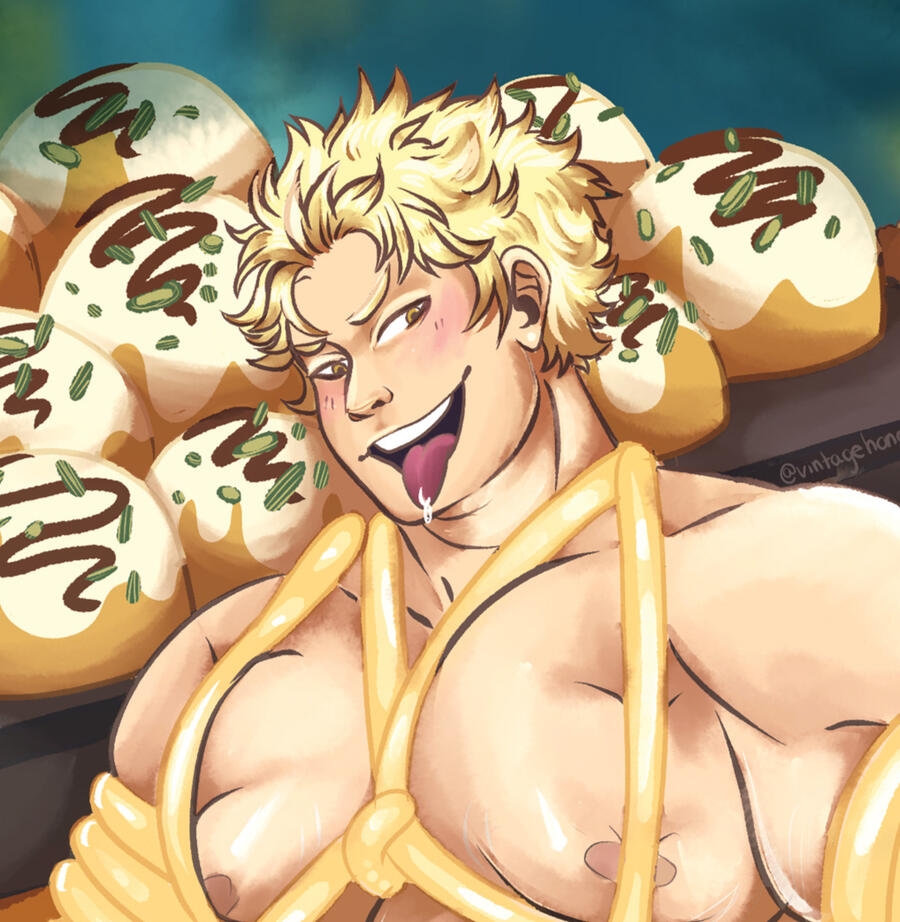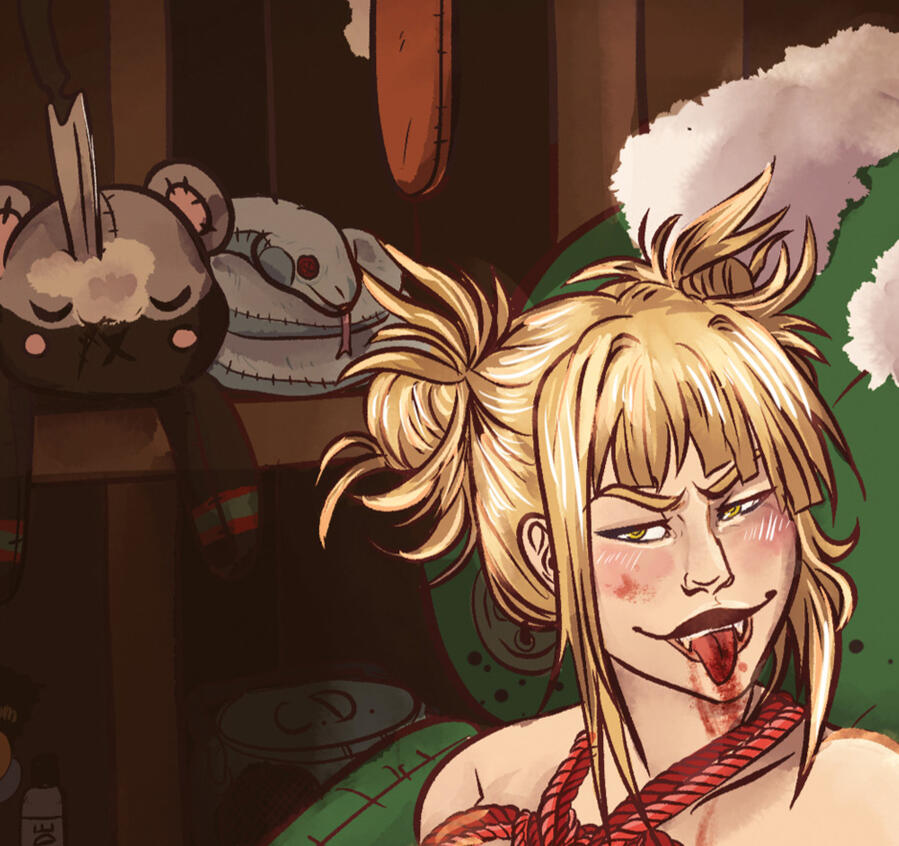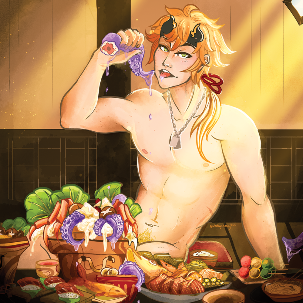 more info ✧ First solely spicy project, and I did three pieces! The first was in collaboration with floatyexplodey aka Rose of Iida and Momo. FatGum is all tied up with his noods in a big bowl of ramen. And Toga is all trussed up pretty with her favorite plush toys that kind of look like... Deku and Ochako... hmm....