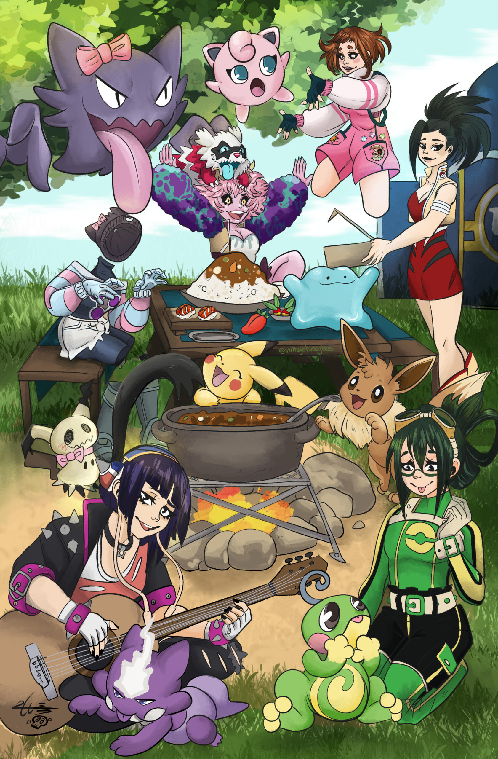 more info ✧ MHA x Video Games crossover zine! Project was unfortunately canceled. SFW piece (upper graphic) is the gals from Class 1-A as Pokemon trainers, NSFW (lower graphic) finds Twili!Jiro and Princess Momo in a compromising position in the royal chambers~