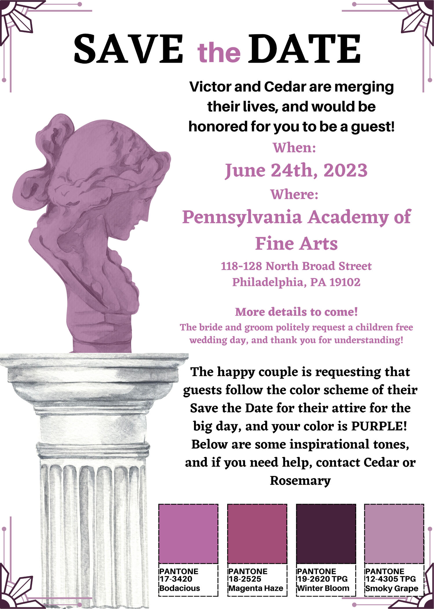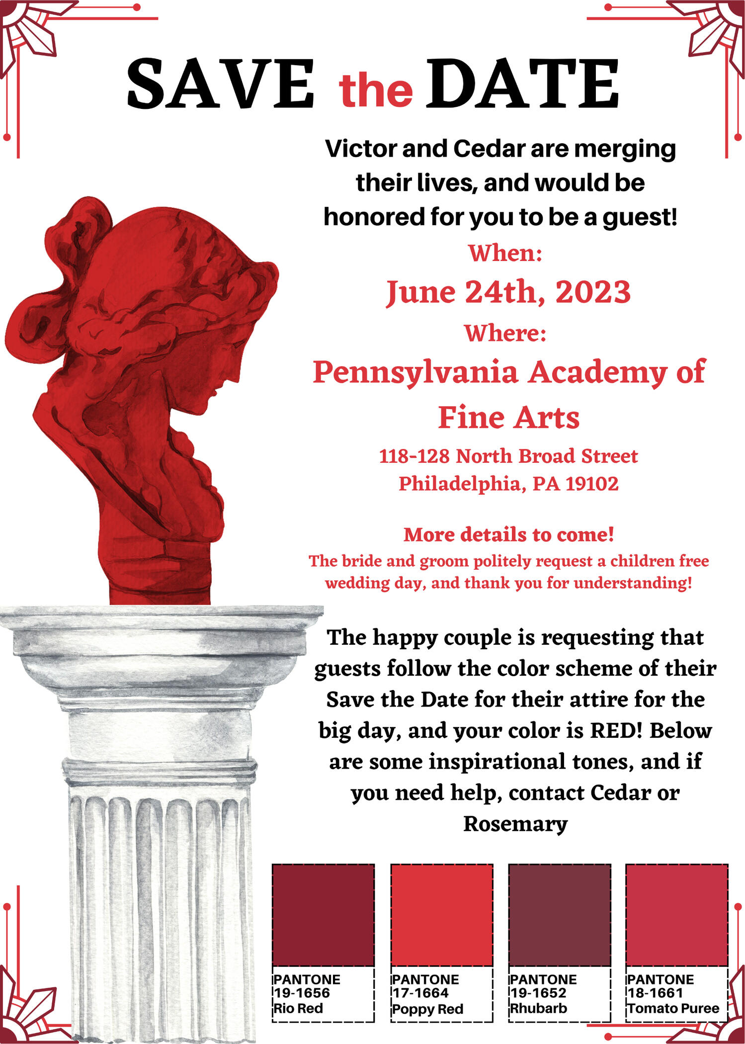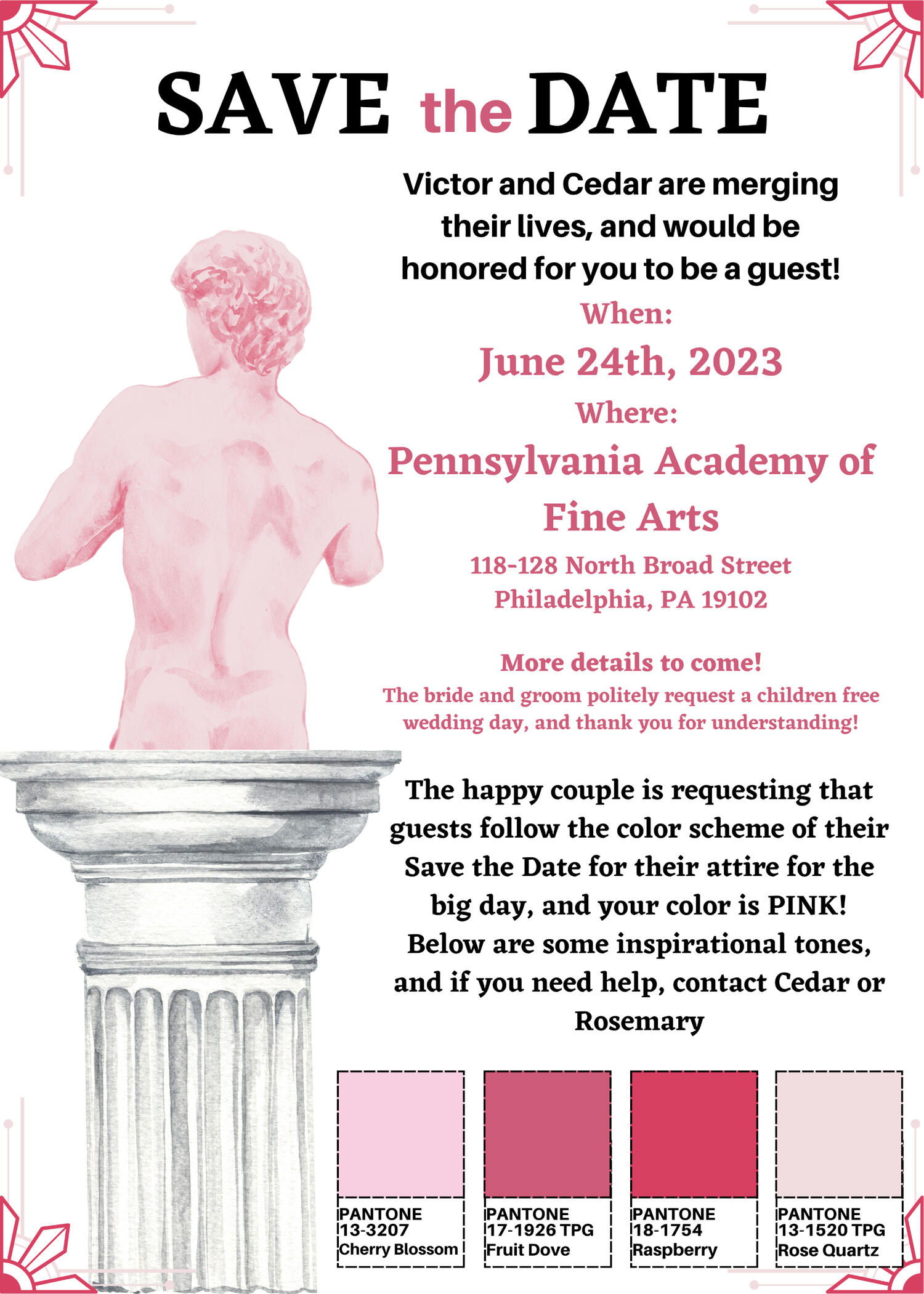 These Save the Dates are inspired by how the PANTONE colors are displayed online. There is one for every color of the rainbow plus pink!