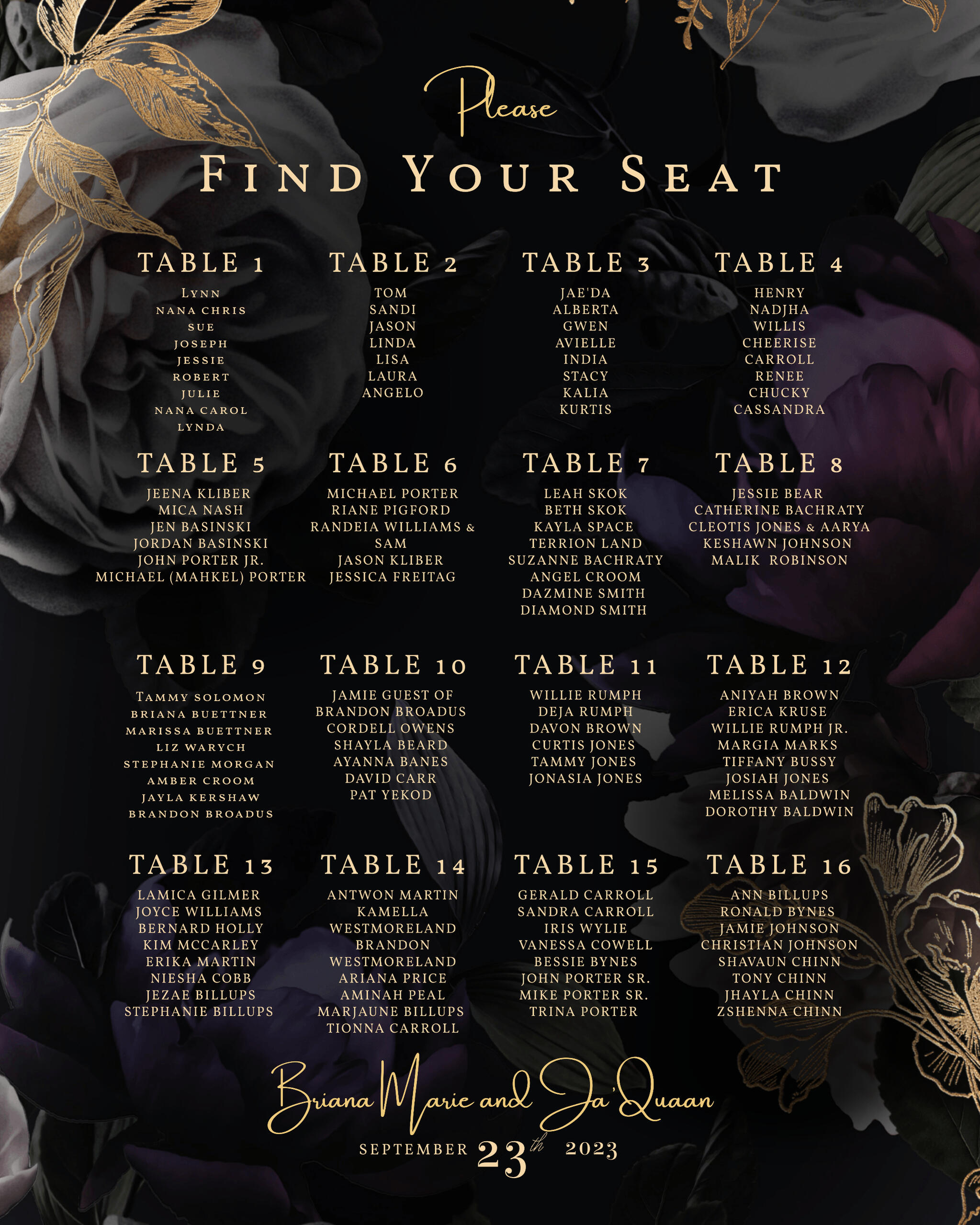 This seating chart was printed out as a large poster instead of using individual seating cards. It was placed in a large frame and propped on the table when guests entered the venue.