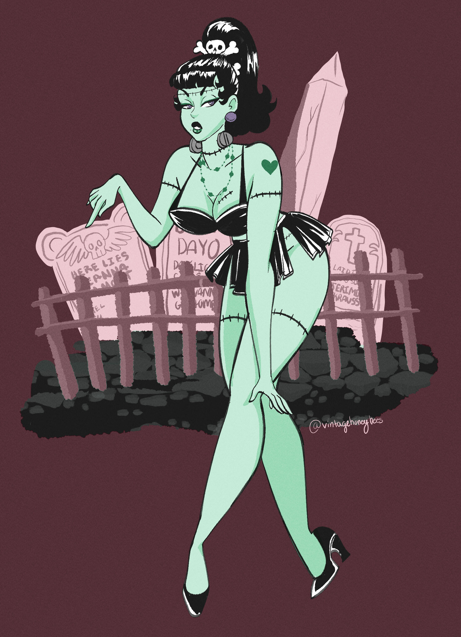 Meet Tabitha, the oldest daughter of the Frankenstellas band! She plays the drums. When she was younger she had her bolts surgically removed from her neck and moved to a spot on the back of her head that she can easily cover with hair. She regrets this decision now being older; but she HATED the way the bolts looked. She is considered the most demure of the group off the stage. But when she's on it she is ON. IT. She is the most level headed of the three; which means when Blair and Samantha get into a pickle, she is always there to fish them out of the jar.