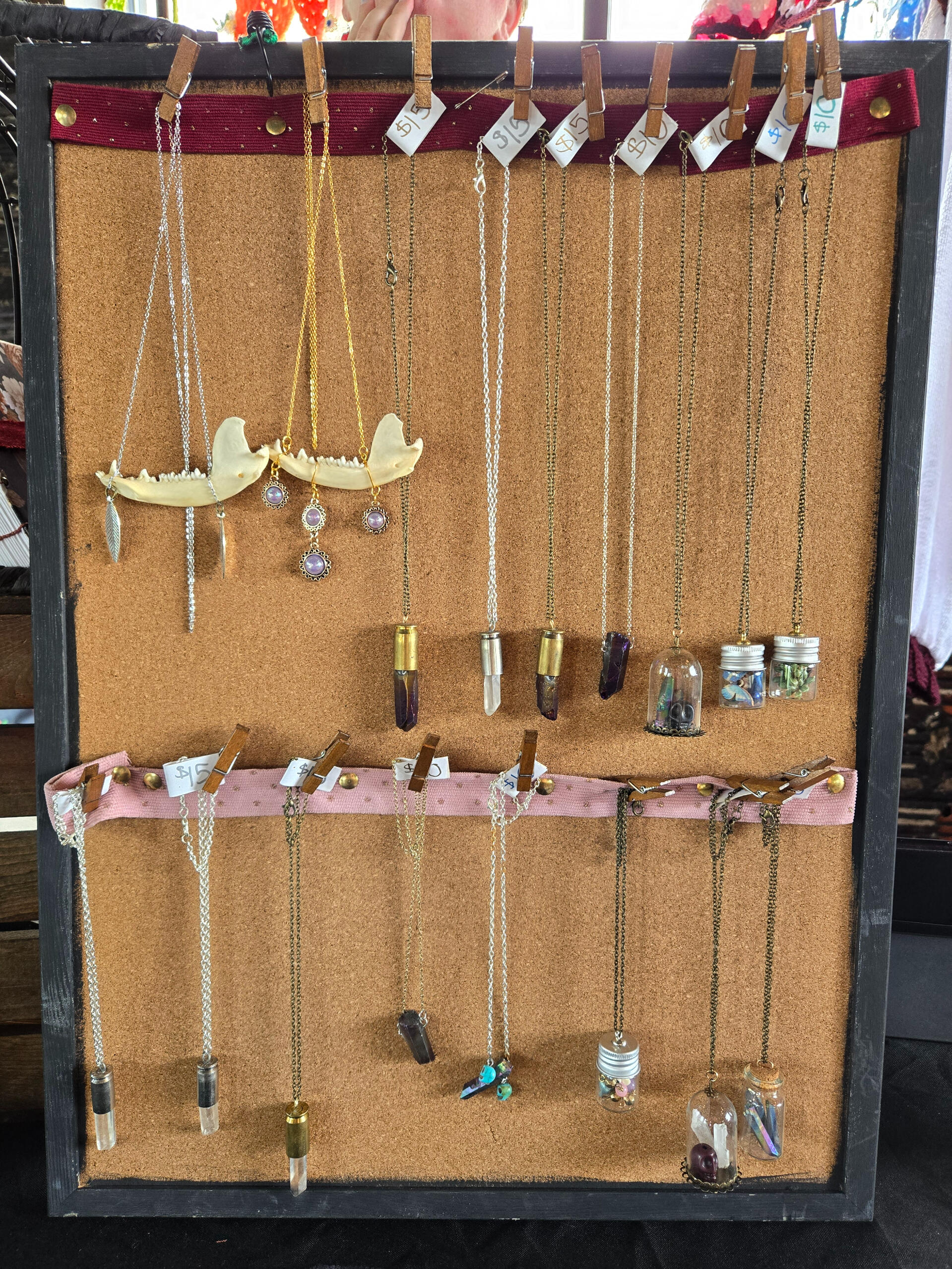 This is my general table set up! I have participated in several art/craft markets and anime conventions over the years. At least 20 are under my belt at this point that I took seriously in developing my brand, The Honey Hive Co. My table usually consists of the following:-Earrings: They are usually one of a kind or extremely limited run batches. They lean towards fantasy, whimsical, or extravagant. Sometimes contain animal bones (see Necklaces)-Necklaces: Same vein as the earrings, but I tend to use more animal bones in their creation (all bones are ethically sourced from local markets. Nothing from overseas and nothing illegal to own here in the United States)-Art Prints: These are photo prints of digital or traditional pieces I have created. There are original works as well as fanart. Mostly they are either 4x6 or 5x7, however, I have limited prints that I offer that go to an 11x14 size.-Original Art: Sometimes I offer the originals of a piece, medium is mentioned at time of sale.-Crochet Accessories: A new addition to my markets! Right now most stock is crocheted shrugs or "shirtless sleeves" As of 2025 there are crocheted buntings in the works as well!