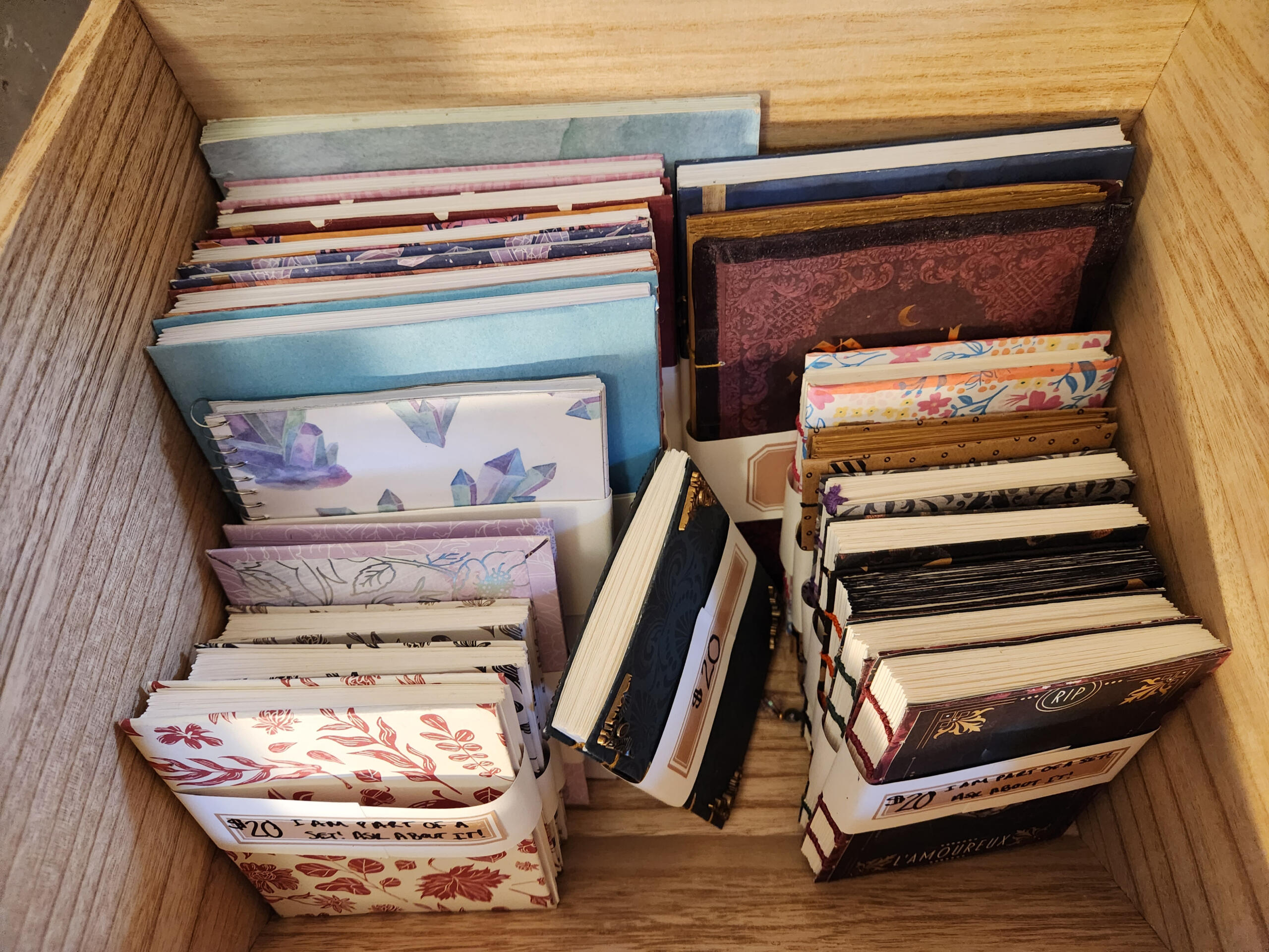.The following are items I am looking to either phase out or are not always at my table/tent-Handbound sketchbooks: These are going to be phased out as of 2025, as the stitching and general construction really takes a toll on my hands.-Mounted Skulls: No photos yet but there are 2 skulls that I had the delight of displaying, one a cracked coyote half skull and a full domesticated rabbit in a cloche. Photos to come.