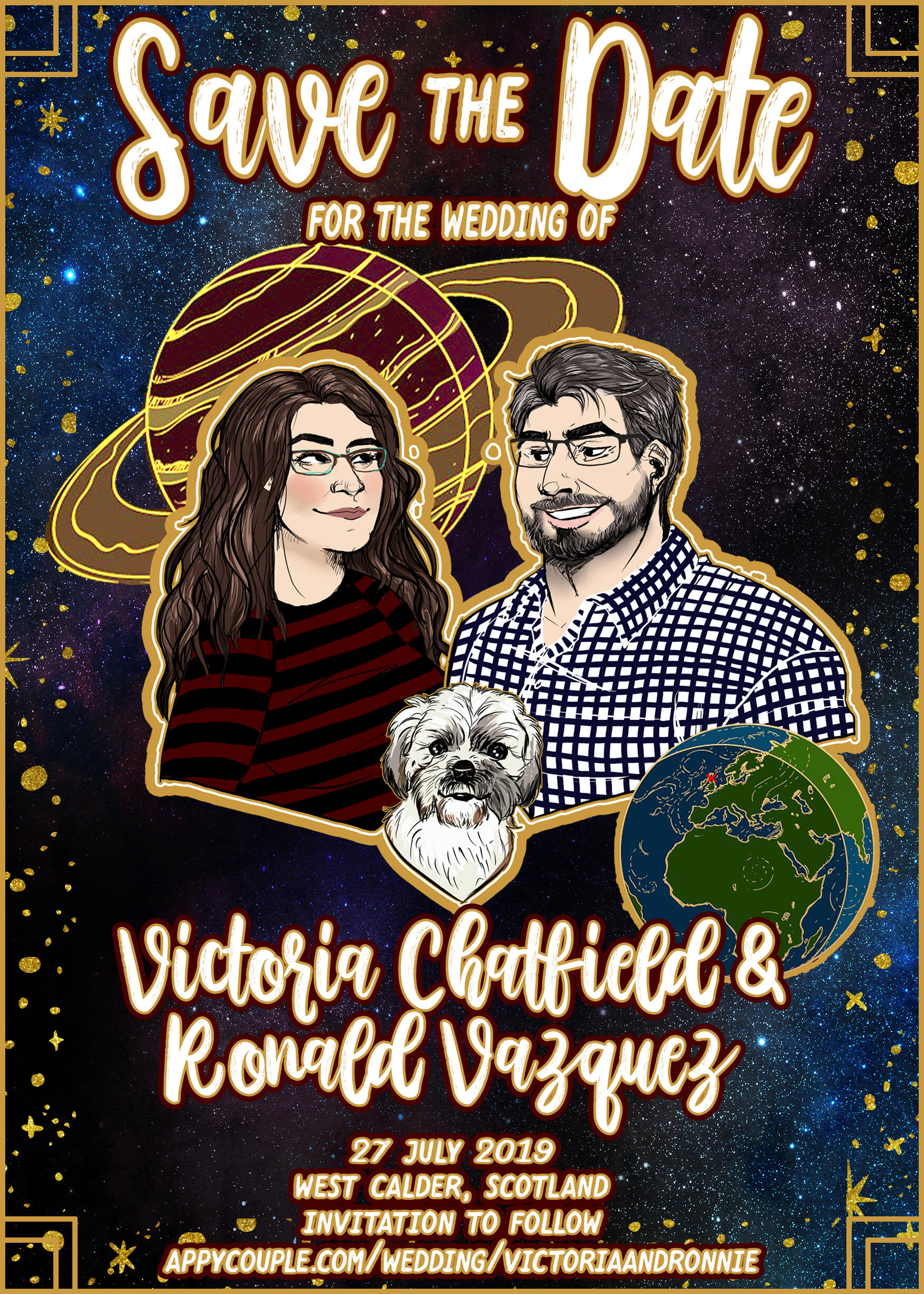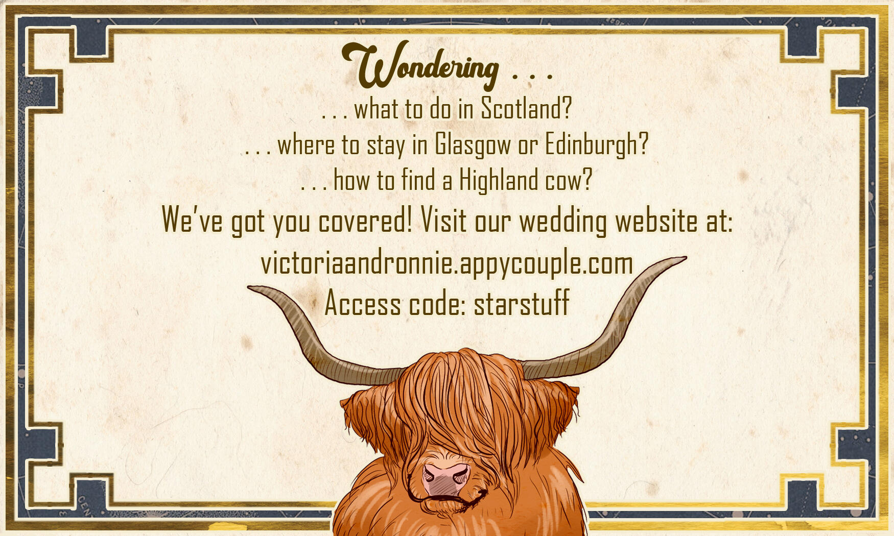 The bride was not from Scotland and had guests coming in from other countries; so the couple made a website on how to navigate Glasgow! The cow illustration was at the brides request
