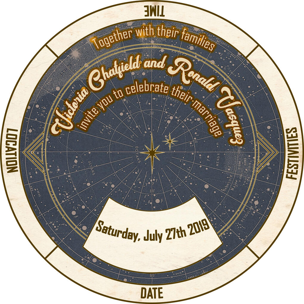 The bride and groom wanted something unconventional for their invitations. So we decided to create a double layered invitation that spun! The top layer's window would reveal the information as it was turned.