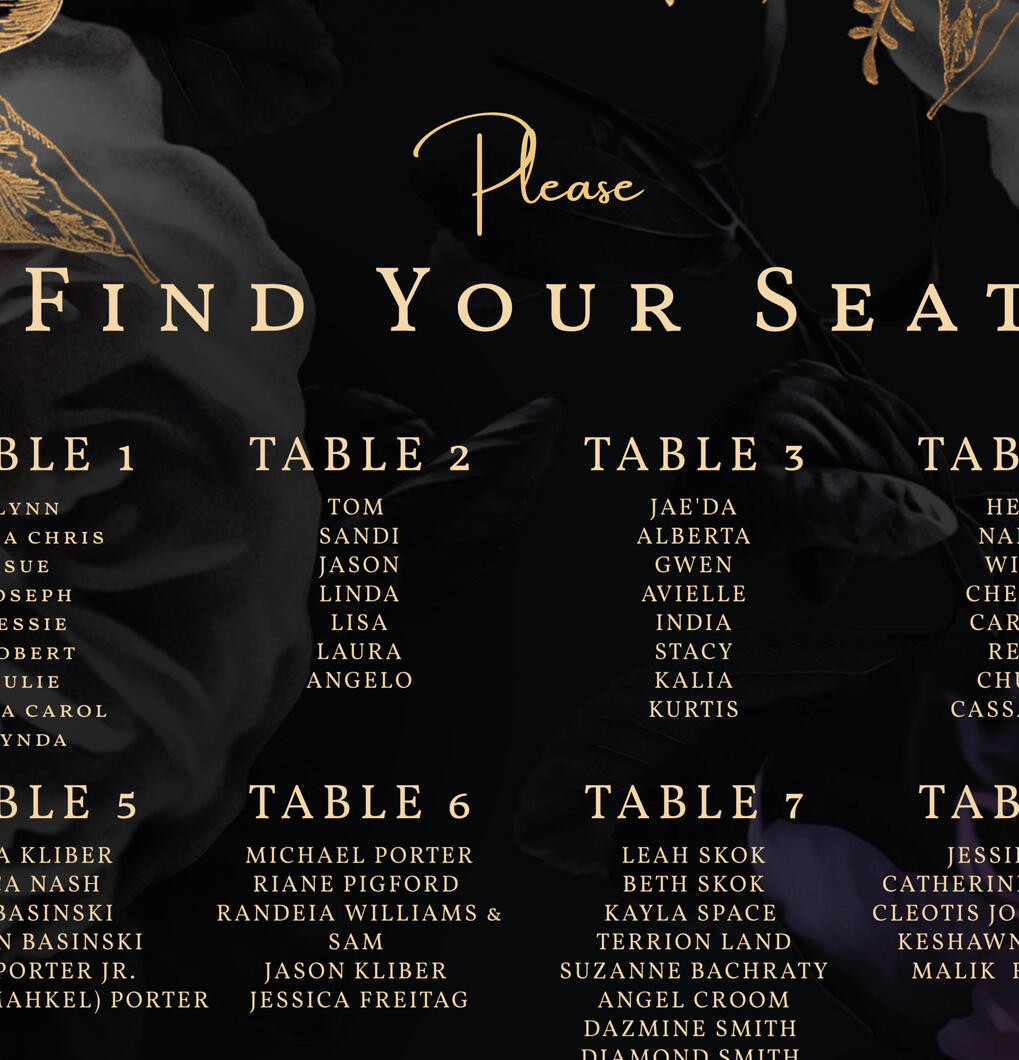 This seating chart was printed out as a large poster instead of using individual seating cards. It was placed in a large frame and propped on the table when guests entered the venue.